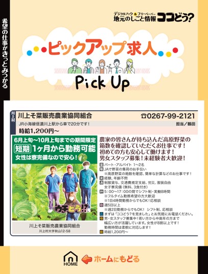 ☎0267-99-2121担当/鶴田農家の皆さんが持ち込んだ高原野菜の箱数を確認していただくお仕事です!初めての方も安心して働けます!男女スタッフ募集!未経験者大歓迎!パート・アルバイト1〜2名JAで野菜の集荷のお手伝い※高原野菜の箱数を確認、簡単な計算などのお仕事です!経験、年齢不問制服貸与、交通費規定支給、労災、服装自由女子寮完備(無料、3食付き)5:00〜17:00の間でシフト制・実働8時間※フルタイム勤務希望の方大歓迎※1日4時間勤務からでもOK!応相談週5日以上※週2日勤務からでもOK!シフト制、応相談まずは「ココどう?を見ました」とお気軽にお電話ください。男・女スタッフ募集中!若い方から中高年の方まで幅広い方が活躍しています。女性が8割以上です!勤務時間は柔軟に対応します!時給1,200円〜川上そ菜販売農業協同組合JR小海線信濃川上駅から車で20分です!時給1,200円〜川上村6月上旬〜10月上旬までの期間限定短期女性は寮完備なので安心!1ヶ月から勤務可能川上そ菜販売農業協同組合川上村大字秋山12-58希望の仕事がきっとみつかる