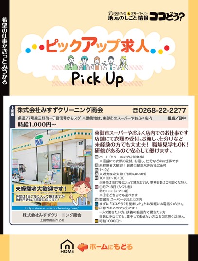 株式会社みすずクリーニング商会県道77号線三好町一丁目信号からスグ※勤務地は、東御市のスーパーやおふく店内時給1,000円〜☎0268-22-2277担当/田中東御市スーパーやおふく店内でのお仕事です店舗にて衣類の受付、お渡し、仕分けなど未経験の方でも大丈夫!職場見学もOK!研修があるので安心して働けます。パート(クリーニング店舗業務)※店舗にて衣類の受付、お渡し、仕分などのお仕事です未経験者大歓迎!普通自動車免許あれば尚可1〜2名交通費規定支給(月額4,000円)10:00〜18:30※時間は1日フルに入って頂きますが、勤務日数はご相談ください。①月7〜8日(シフト制)②月15日(シフト制)※①②どちらでも選べます東御市スーパーやおふく店内まずは「ココどう?を見ました」とお気軽にお電話ください。研修があるので安心です!一人で働きたい方、扶養の範囲内で働きたい方日数は少なくても、集中して働きたい方などご応募ください。時給1,000円〜未経験者大歓迎です!時間は1日フルに入って頂きますが勤務日数はご相談に応じます!https://www.misuzucleaning.com/株式会社みすずクリーニング商会上田市御所712-6希望の仕事がきっとみつかる上田市