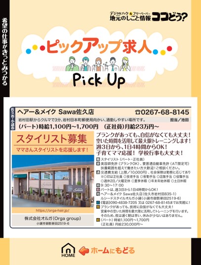 ヘアー&メイクSawa佐久店☎0267-68-8145担当/池田岩村田駅からクルマで3分、岩村田本町郵便局向かい、通勤しやすい場所です。(パート)時給1,100円〜1,700円(正社員)月給23万円〜スタイリスト募集ママさんスタイリストを応援します!ブランクがあっても、自信がなくても大丈夫!空いた時間を活用して最大限トレーニングします!週3日から、1日4時間からOK!子育てママ応援!学校行事も大丈夫!スタイリスト(パート・正社員)美容師免許(ブランクOK)、要普通自動車免許(AT限定可)扶養範囲を超えて働きたい方大歓迎!ご相談ください。交通費支給(上限/10,000円)、社会保険は勤務に応じてあり※◎印は正社員◎技術手当◎皆勤手当◎店販手当◎役職手当◎週休2日/火曜定休◎夏季休暇◎年末年始休暇◎土日休暇9:30〜17:00パートは、週3日から1日4時間からOK!ヘアー&メイクSawa佐久店(佐久市岩村田835-1)ルシードスタイルオルガ小諸(小諸市御影新田2519-6)《電話》090-4838-7205又は0267-68-8145までお気軽に!ブランクがあっても、技術に自信がなくても大丈夫!営業中の空いた時間を最大限に活用してトレーニングを行います。そのため、夜は遅く朝は早い、休みが少ないはありません。(パート)時給1,100円〜1,700円(正社員)月給230,000円〜https://orga-hair.jp/株式会社オルガ(Orgagroup)小諸市御影新田2519-6希望の仕事がきっとみつかる佐久市・小諸市