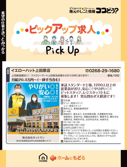 イエローハット上田原店上田創造館近く!ファミリーマート上田長池店様からすぐの所にあります!月給20.4万円〜(一律手当含む)☎0268-29-1680担当/川口やりがい◎!安心◎!自動車についての知識はなくても大丈夫!懇切丁寧に指導いたします♪http://www.yg-hotman.com/株式会社ホットマン[本社]宮城県仙台市太白区西多賀4-4-17東証スタンダード上場、1200人以上の従業員がおり、安心◎!やりがい◎!ピットスタッフ、レジスタッフともに募集します!男女問わず大歓迎です!正社員ピット・接客スタッフレジ・接客スタッフ高卒以上、普通自動車免許3〜4名昇給あり、賞与あり、社会保険完備、交通費規定支給制服貸与、家族手当、退職金制度あり、職務手当、職位手当役職手当、時間外手当、法定休出手当、地域手当10:00〜19:00週休2日制(月6〜9日)上田市上田原1175-3まずは「ココどう?を見ました」とお気軽にお電話ください。カー用品のイエローハットを主事業として、中古カー用品のアップガレージ、CDなどのレンタル・販売のツタヤなどの経営をおこなっております。月給204,000円〜(一律手当含む)希望の仕事がきっとみつかる上田市