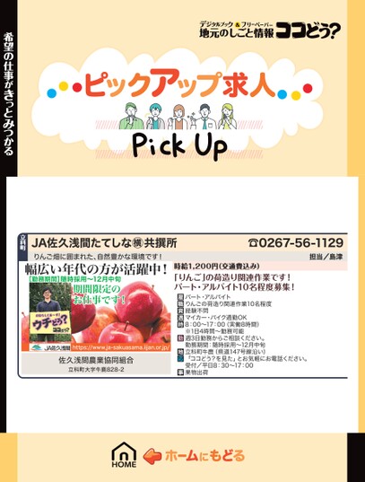☎0267-56-1129担当/島津時給1,200円(交通費込み)「りんご」の荷造り関連作業です!パート・アルバイト10名程度募集!パート・アルバイトりんごの荷造り関連作業10名程度経験不問マイカー・バイク通勤OK8:00〜17:00(実働8時間)※1日4時間〜勤務可能週3日勤務からご相談ください。勤務期間:随時採用〜12月中旬立科町牛鹿(県道147号線沿い)「ココどう?を見た」とお気軽にお電話ください。受付/平日8:30〜17:00果物出荷JA佐久浅間たてしな○横共所りんご畑に囲まれた、自然豊かな環境です!幅広い年代の方が活躍中![勤務期間]随時採用〜12月中旬期間限定のお仕事です!https://www.ja-sakuasama.iijan.or.jp/佐久浅間農業協同組合立科町大字牛鹿828-2希望の仕事がきっとみつかる立科町