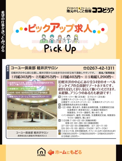 コーユー倶楽部軽井沢サロン☎0267-42-1311担当/採用担当旧軽井沢の中心部に位置し、軽井沢駅からは徒歩15分の好立地で通勤しやすいです。①月給30万円〜②月給25万円〜③月給40万円〜④⑤時給1,200円〜希望の仕事がきっとみつかる軽井沢〇会員制ホテルの為、お客様の大半が日本国内の方です。安心して働いていただけます。〇未経験OK!ブランクOKです!〇40代・50代・60代のミドル・シニア世代歓迎!〇調理スタッフ(スーシェフ)月給40万円スタート!http://www.japantotalclub.co.jp/facilities/karuizawasalonコーユー倶楽部軽井沢サロン長野県北佐久郡軽井沢町軽井沢2-3旧軽井沢の中心にあり全34室のオーベルジュタイプの会員制リゾートホテルです。経営も安定しており、安心して働いていただけます。未経験、ブランクのある方も歓迎です!①マネージャー職(正社員)②フロント(正社員)③調理スタッフ(スーシェフ)(正社員)④朝食サービススタッフ(パート)⑤清掃スタッフ(パート)③調理師免許お持ちの方優遇<正>昇給・賞与あり、各種社会保険完備、交通費規定支給社員寮あり(単身者のみ)、社員紹介制度あり制服貸与、マイカー通勤可、賄いあり、他<パ>昇給あり、雇用・労災保険、交通費規定支給、制服貸与マイカー通勤可、賄いあり①②日勤7:00〜22:00(実働8時間)夜勤22:00〜翌8:00(実働8時間)③7:00〜22:00(実働8時間)④7:30〜11:00⑤9:00〜15:00・週2日〜でもOK!WワークOK!①②③シフト制、変形労働制採用、オフシーズンは月12回の休みもあり①月給300,000円〜②月給250,000円〜③月給400,000円〜④⑤時給1,200円〜