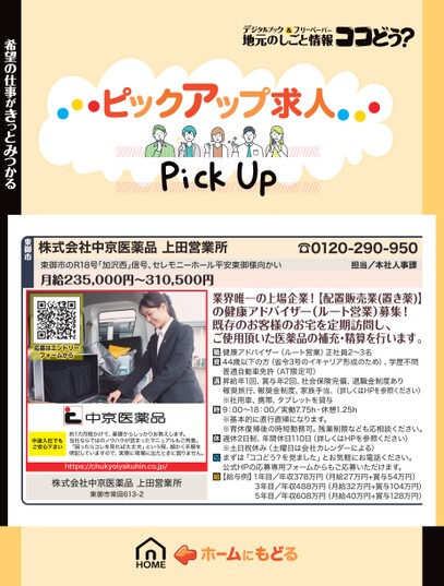 ☎0120-290-950担当/本社人事課株式会社中京医薬品上田営業所東御市のR18号「加沢西」信号、セレモニーホール平安東御様向かい月給235,000円〜310,500円東御市希望の仕事がきっとみつかる応募はエントリーフォームから中途入社でもご安心下さい約1カ月程かけて、基礎からしっかりお教えします。当社ならではのノウハウが詰まったマニュアルもご用意。「困ったらコレを見れば大丈夫」という程、細かく手順を明記していますので、実際に現場に出たときに困りません。https://chukyoiyakuhin.co.jp/株式会社中京医薬品上田営業所東御市常田613-2業界唯一の上場企業!【配置販売業(置き薬)】の健康アドバイザー(ルート営業)募集!既存のお客様のお宅を定期訪問し、ご使用頂いた医薬品の補充・精算を行います。健康アドバイザー(ルート営業)正社員2〜3名44歳以下の方(省令3号のイキャリア形成のため)、学歴不問普通自動車免許(AT限定可)昇給年1回、賞与年2回、社会保険完備、退職金制度あり報奨旅行、報奨金制度、家族手当、(詳しくはHPを参照ください)※社用車、携帯、タブレットを貸与9:00〜18:00/実働7.75h・休憩1.25h※基本的に直行直帰になります。※育休復帰後の時短勤務可。残業制限なども応相談ください。週休2日制、年間休日110日(詳しくはHPを参照ください)※土日祝休み(土曜日は会社カレンダーによる)まずは「ココどう?を見ました」とお気軽にお電話ください。公式HPの応募専用フォームからもご応募いただけます。【給与例】1年目/年収378万円(月給27万円+賞与54万円)3年目/年収488万円(月給32万円+賞与104万円)5年目/年収608万円(月給40万円+賞与128万円)