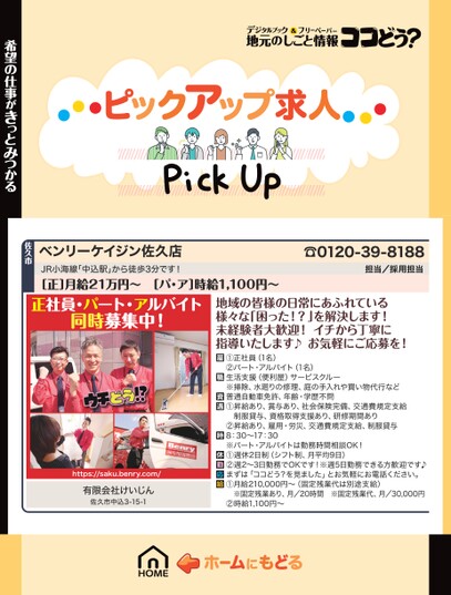 [正]月給21万円〜[パ・ア]時給1,100円〜正社員・パート・アルバイト同時募集中!地域の皆様の日常にあふれている様々な「困った!?」を解決します!未経験者大歓迎!イチから丁寧に指導いたします♪お気軽にご応募を!希望の仕事がきっとみつかる佐久市ベンリーケイジン佐久店JR小海線「中込駅」から徒歩3分です!☎0120-39-8188担当/採用担当①正社員(1名)②パート・アルバイト(1名)生活支援(便利屋)サービスクルー※掃除、水りの修理、庭の手入れや買い物代行など普通自動車免許、年齢・学歴不問①昇給あり、賞与あり、社会保険完備、交通費規定支給制服貸与、資格取得支援あり、研修期間あり②昇給あり、雇用・労災、交通費規定支給、制服貸与8:30〜17:30※パート・アルバイトは勤務時間相談OK!①週休2日制(シフト制、月平均9日)②週2〜3日勤務でOKです!※週5日勤務できる方歓迎です♪まずは「ココどう?を見ました」とお気軽にお電話ください。①月給210,000円〜(固定残業代は別途支給)※固定残業あり、月/20時間※固定残業代、月/30,000円②時給1,100円〜https://saku.benry.com/有限会社けいじん佐久市中込3-15-1