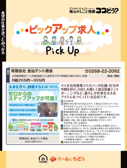 有限会社金仙テント商会上田創造館近く「上田創造館入口」信号をツルヤ神畑店方面に向かい左側月給20万円〜30万円☎0268-22-2092担当/城田希望の仕事がきっとみつかる上田市未来を作り、挑戦するものづくり。ゼロからのステップアップが可能!競合他社が少ない職種の強み!創業60年の企業で正社員雇用!会社負担で資格取得可能!暮らしや仕事を支えるアイテムをつくっている会社https://www.kinsentent.com/有限会社金仙テント商会上田市上田原1343-1<<正社員募集>>カフェや店舗・住宅の外観を彩り、日差しを優しく遮る装飾テントオーニングなど、暮らしや仕事を支えるアイテムをつくっている会社です。正社員2名建物の外に取り付ける日よけや、工場など大きなスペースに取り付けるフィルムカーテンやクリーンブース、シートシャッターなどを製造・施工・張替をするお仕事です。普通自動車免許、高卒以上、35歳以下(省令3号イ)昇給、各種社会保険完備・退職金制度あり・交通費規定支給8:30〜17:30(休憩90分/10:00・お昼休み・15:00)日曜日、祝日、第2土曜日(有給休暇とりやすいです)年末年始、GW、お盆休みまずは「ココどう?を見ました」とお気軽にお電話ください。創業から60年以上、多くの、会社様と長年にわたる取引があり信頼と実績を積み重ねてきました。「モノづくりに興味がある」「手に職をつけたい」「いろんな現場を見てみたい」そんな方は、ぜひ金仙テント商会での仕事を!◎未経験者大歓迎!一緒に成長しましょう。月給200,000円〜300,000円