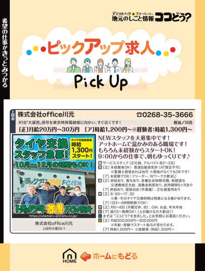 株式会社office川元☎0268-35-3666R18「大屋西」信号を東京特殊電線様に向かい、すぐ近くです!担当/川元[正]月給20万円〜30万円[ア]時給1,200円〜※経験者:時給1,300円〜希望の仕事がきっとみつかる上田市タイヤ交換経験者タイヤ交換時給1,300円スタッフ急募!スタート!10月〜12月の短期もOK!https://utamaro-shinshu.co.jp/株式会社office川元上田市大屋25-1NEWスタッフを大募集中です!アットホームで温かみのある職場です!もちろん未経験からスタートOK!9:00からの仕事で、朝もゆっくりです♪サービススタッフ(正社員、アルバイト各2〜3名)[正]未経験者OK!普通自動車免許(AT限定不可)※整備士資格あれば尚可※資格がなくてもOKです![ア]未経験でOK!フリーター、Wワーク大歓迎♪[正]昇給あり、賞与あり、各種社会保険完備、制服貸与交通費規定支給、退職金制度あり、試用期間6ヶ月あり[ア]昇給あり、服装自由(作業着)、正社員登用あり[正]9:00〜17:30※春・冬のタイヤ交換時期は残業になる事があります。[ア]1日3〜4時間勤務でOK![正]月6〜8日(月曜定休、他)、GW、お盆、年末年始[ア]週1日〜勤務OK!(土日働ける方大歓迎!)まずは「ココどう?を見ました」とお気軽にお電話ください。[正]月給200,000円〜300,000円※年齢・経験でスタート給与が変わります。[ア]時給1,200円〜※経験者:時給1,300円〜