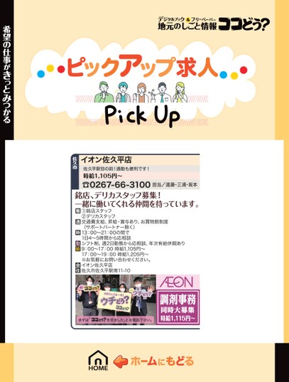 担当/遠藤・三浦・坂本銘店、デリカスタッフ募集!一緒に働いてくれる仲間を待っています。①銘店スタッフ②デリカスタッフ交通費支給、昇給・賞与あり、お買物割制度(サポートパートナー除く)13:00〜21:00の間で1日4〜5時間から応相談シフト制、週2日勤務から応相談、年次有給休暇あり9:00〜17:00時給1,105円〜17:00〜19:00時給1,205円〜※お気軽にお問い合わせください。イオン佐久平店佐久市佐久平駅南11-10イオン佐久平店佐久平駅目の前!通勤も便利です!時給1,105円〜☎0267-66-3100佐久市希望の仕事がきっとみつかる調剤事務同時大募集時給1,115円〜まずは「を見ました」とお電話下さい。