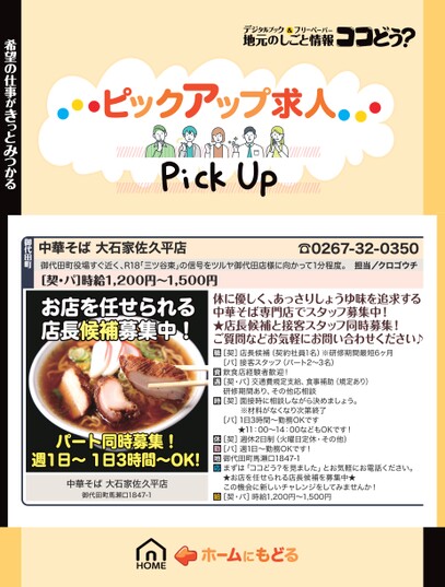 中華そば大石家佐久平店☎0267-32-0350御代田町役場すぐ近く、R18「三ツ谷東」の信号をツルヤ御代田店様に向かって1分程度。担当/クロゴウチ[契・パ]時給1,200円〜1,500円希望の仕事がきっとみつかる御代田町お店を任せられる店長候補募集中!パート同時募集!週1日〜1日3時間〜OK!中華そば大石家佐久平店御代田町馬瀬口1847-1体に優しく、あっさりしょうゆ味を追求する中華そば専門店でスタッフ募集中!★店長候補と接客スタッフ同時募集!ご質問などお気軽にお問い合わせください♪[契]店長候補(契約社員1名)※研修期間最短6ヶ月[パ]接客スタッフ(パート2〜3名)飲食店経験者歓迎![契・パ]交通費規定支給、食事補助(規定あり)研修期間あり、その他応相談[契]面接時に相談しながら決めましょう。※材料がなくなり次第終了[パ]1日3時間〜勤務OKです★11:00〜14:00などもOKです![契]週休2日制(火曜日定休・その他)[パ]週1日〜勤務OKです!御代田町馬瀬口1847-1まずは「ココどう?を見ました」とお気軽にお電話ください。★お店を任せられる店長候補を募集中★この機会に新しいチャレンジをしてみませんか![契・パ]時給1,200円〜1,500円