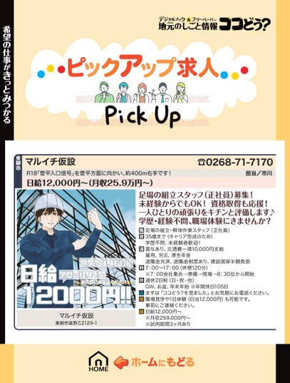 足場の組立スタッフ(正社員)募集!未経験からでもOK!資格取得も応援!一人ひとりの頑張りをキチンと評価します♪学歴・経験不問、職場体験にきませんか?足場の組立・解体作業スタッフ(正社員)35歳まで(キャリア形成のため)学歴不問、未経験者歓迎!賞与あり、交通費一律10,000円支給雇用、労災、厚生年金退職金共済、退職金制度あり、建設国保半額負担7:00〜17:00(休憩120分)※7:00会社集合→準備→現場→8:30位から開始週休2日制(日・祝・他)GW、お盆、年末年始※年間休日105日まずは「ココどう?を見ました」とお気軽にお電話ください。職場見学や1日体験(日当12,000円)も可能です。事前にご連絡ください。日給12,000円〜※月収259,000円〜※試用期間3ヶ月ありマルイチ仮設東御市滋野乙2129-1☎0268-71-7170担当/市川マルイチ仮設R18「菅平入口信号」を菅平方面に向かい、約400m右手です!日給12,000円〜(月収25.9万円〜)東御市希望の仕事がきっとみつかる