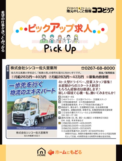 株式会社シンコー佐久営業所☎0267-68-8000佐久市立高瀬小学校近く、高瀬小西」の信号を湯川に向かいすぐです。①月給28万円〜40万円②月給28万円〜43万円※募集内容参照担当/採用担当希望の仕事がきっとみつかる佐久市一歩先を行く物流のエキスパートhttps://www.shinko8000.co.jp/株式会社シンコー佐久営業所佐久市鳴瀬1402-14t・大型ドライバー、営業スタッフ募集!未経験からのスタート大歓迎!もちろん経験者は優遇します♪新しい環境で心機一転、働いてみませんか!正社員3〜4名①4tドライバー②大型ドライバー③営業スタッフ①中型自動車免許②大型自動車免許③普通自動車免許、キャリア形成の為45歳以下昇給あり、賞与あり、交通費規定支給、社会保険完備制服貸与、退職金制度、皆勤手当、各種資格取得支援制度①②当社の運行スケジュールによる8時間勤務③8:00〜17:00週休2日制(日、祝、第2・4土曜日)※年間休日106日GW、お盆、年末年始など①月給280,000円〜400,000円②月給280,000円〜430,000円③月給250,300円〜357,600円※③は固定残業代61,300円〜87,600円を含む時間外手当は、時間外労働時間の有無にかかわらず固定残業代として支給、45時間を超える時間外労働は追加支給。