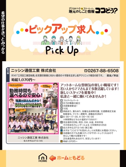ニッシン通信工業株式会社☎0267-88-6508R141「三河田工業団地南」を双葉印刷様に向かい最初の十字路を左折し坂戸クリニック様目の前です。時給1,070円〜担当/井出希望の仕事がきっとみつかる佐久市お仕事はこんな雰囲気フルタイムですが、勤務時間も選べるので安心!残業はほとんどナシ!休日もしっかりとれるので、メリハリをもって働けます!アットホームな雰囲気!ニッシン通信工業株式会社佐久市中込3713-145アットホームな雰囲気の楽しい職場です!若い人からママさんまで多数活躍しています!新しいスタッフを募集中!私達と一緒に働いてみませんか!フルタイムパート圧力計機器の組立未経験者歓迎!10名昇給あり、賞与あり、各種社会保険完備、交通費規定支給制服貸与、マイカー通勤可、退職金共済あり8:00〜17:00、9:00〜16:00※時間帯はどちらか選択ができます!完全週休2日制、祝日、GW、お盆、年末年始その他会社カレンダーによる※年間休日125日佐久市中込3713-145(新工場)まずは「ココどう?を見ました」とお気軽にお電話ください。未経験の方でも先輩スタッフがサポートしてくれるので安心して働ける環境です!正社員登用もあるので、安定しています!時給1,070円〜