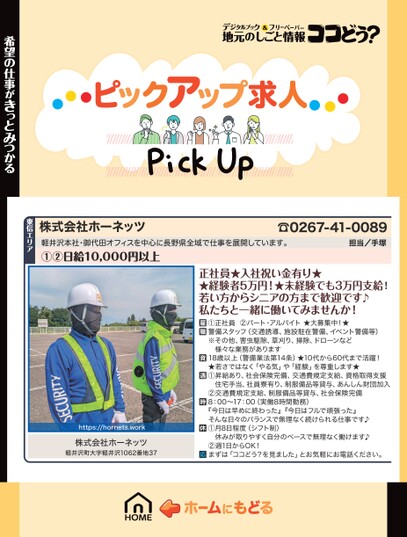 株式会社ホーネッツ軽井沢本社・御代田オフィスを中心に長野県全域で仕事を展開しています。①②日給10,000円以上☎0267-41-0089担当/手塚正社員★入社祝い金有り★★経験者5万円!★未経験でも3万円支給!若い方からシニアの方まで歓迎です♪私たちと一緒に働いてみませんか!①正社員②パート・アルバイト★大募集中!★警備スタッフ(交通誘導、施設駐在警備、イベント警備等)※その他、害虫駆除、草刈り、掃除、ドローンなど様々な業務があります18歳以上(警備業法第14条)★10代から60代まで活躍!★若さではなく「やる気」や「経験」を尊重します★①昇給あり、社会保険完備、交通費規定支給、資格取得支援住宅手当、社員寮有り、制服備品等貸与、あんしん財団加入②交通費規定支給、制服備品等貸与、社会保険完備8:00〜17:00(実働8時間勤務)『今日は早めに終わった』『今日はフルで頑張った』そんな日々のバランスで無理なく続けられる仕事です♪①月8日程度(シフト制)休みが取りやすく自分のペースで無理なく働けます♪②週1日からOK!まずは「ココどう?を見ました」とお気軽にお電話ください。https://hornets.work株式会社ホーネッツ軽井沢町大字軽井沢1062番地37希望の仕事がきっとみつかる東信エリア