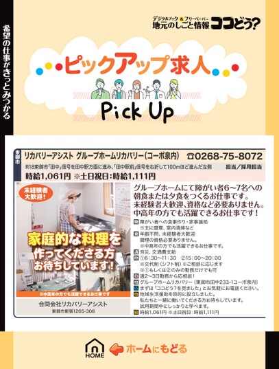 リカバリーアシストグループホームリカバリー(コーポ泉内)☎0268-75-8072R18東御市「田中」信号を田中駅方面に進み、田中駅前」信号を右折して100mほど進んだ左側時給1,061円※土日祝日:時給1,111円担当/採用担当未経験者大歓迎!家庭的な料理を作ってくださる方お待ちしています!※中高年の方でも活躍できるお仕事です合同会社リカバリーアシスト東御市新張1265-308グループホームにて障がい者6〜7名への朝食または夕食をつくるお仕事です。未経験者大歓迎、資格など必要ありません。中高年の方でも活躍できるお仕事です!障がい者への食事作り・家事援助※主に調理、室内清掃など年齢不問、未経験者大歓迎調理の資格必要ありません。※中高年の方でも活躍できるお仕事です。労災、交通費支給①6:30〜11:30②15:00〜20:00※交代制(シフト制)※ご相談に応じます※①もしくは②のみの勤務だけでも可週2〜3日勤務から応相談!グループホームリカバリー(東御市田中233-1コーポ泉内)まずは「ココどう?を見ました」とお気軽にお電話ください。地域生活援助を目的に設立しました。私たちと一緒に働いてくださる方お待ちしています。試用期間中にしっかりと学べます。時給1,061円※土日祝日:時給1,111円希望の仕事がきっとみつかる東御市