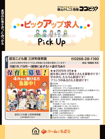 ☎0268-28-1160担当/副園長児玉認定こども園三好町保育園上田市立第四中学校すぐそば。保育園と乳児園を運営しています!月給18.7万円〜(経験に応ずる)+諸手当あり上田市希望の仕事がきっとみつかる保育士募集!4月から働ける方急募中!http://miyoshicho.com/認定こども園三好町保育園上田市諏訪形1169-1★★2026年4月★★新年度に向けて保育士さんを募集中です♪学卒の方、もちろん歓迎です♪ブランクのある方も大歓迎です!正社員保育士スタッフ(1〜2名)※学卒の方、ブランクのある方歓迎です♪★2026年4月★新年度に向けての保育士さんを募集中です♪4月から働ける方をお待ちしております。保育士免許、幼稚園教諭免許昇給あり、交通費規定支給、制服貸与、社会保険完備賞与あり、住宅手当あり、退職金制度あり、処遇改善手当あり8:00〜17:00平日保育(7:00〜19:15まで)土曜日保育(7:00〜18:00まで)日祝(土曜日、月2回程度出勤あり)保育園:上田市諏訪形1169-1乳児園:上田市御所232-3まずは「ココどう?を見ました」とお気軽にお電話ください。月給187,000円〜(経験に応ずる)+諸手当あり