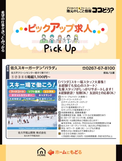 ☎0267-67-8100担当/土屋佐久スキーガーデン「パラダ」佐久平クリーンセンター様すぐ隣です!①②③④⑤時給1,100円〜佐久市スキー場で働こう!フードコートリフト監視レンタルチケットカウンターキッズランド未経験歓迎♪短期OK♪友達同士OK♪https://www.saku-parada.jp/佐久平尾山開発株式会社佐久市下平尾2681「パラダ」スキー場スタッフ大募集!未経験でも安心のスタート♪先輩スタッフがしっかりサポートします!未経験歓迎♪短期OK♪友達同士の応募OK♪パート・アルバイト(大募集!)①フードコートスタッフ②チケットカウンタースタッフ③レンタルスタッフ④リフト監視業務スタッフ⑤キッズランド監視業務スタッフ未経験者歓迎、経験者優遇!交通費規定支給、食事、リフトなど従業員割引あり8:00〜17:00※シフト制、応相談週休2日※出勤日時はご相談に応じます!★年末年始、土日のみ、平日のみなどの短期勤務もOK★佐久スキーガーデン「パラダ」(佐久市上平尾2066-1)学生・Wワーク・主婦(夫)・シニアも大歓迎降雪の少ない地域なので通勤も安心!①②③④⑤時給1,100円〜<月収例>時給1,100円・1日8時間勤務:月収18万円以上