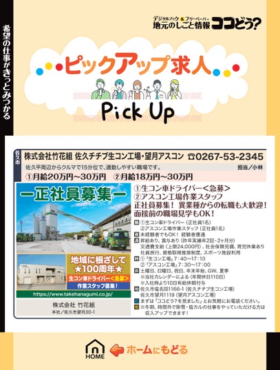 株式会社竹花組佐久チチブ生コン工場・望月アスコン佐久平周辺からクルマで15分位で、通勤しやすい職場です。①月給20万円〜30万円②月給18万円〜30万円☎0267-53-2345担当/小林希望の仕事がきっとみつかる佐久市ー正社員募集ー地域に根ざして★100周年★生コン車ドライバー<急募>作業スタッフ募集!https://www.takehanagumi.co.jp/株式会社竹花組本社/佐久市望月30-1①生コン車ドライバー<急募>②アスコン工場作業スタッフ正社員募集!異業種からの転職も大歓迎!面接前の職場見学もOK!①生コン車ドライバー(正社員1名)②アスコン工場作業スタッフ(正社員1名)未経験者でもOK!経験者優遇昇給あり、賞与あり(昨年実績年2回・2ヶ月分)交通費支給(上限24,000円)、社会保険完備、育児休業あり社員旅行、資格取得推奨制度、スポーツ施設利用①「生コン工場」7:40〜17:10②「アスコン工場」7:30〜17:00土曜日、日曜日、祝日、年末年始、GW、夏季※当社カレンダーによる(年間休日110日)※入社時より10日有給休暇付与佐久市塩名田1166-1(佐久チチブ生コン工場)佐久市望月1119(望月アスコン工場)まずは「ココどう?を見ました」とお気軽にお電話ください。※冬期、時間外で除雪・塩カルの仕事をやっていただける方は収入アップできます!