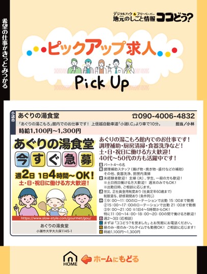「あぐりの湯こもろ」館内でのお仕事です!上信越自動車道「小諸I.C」より車で10分。時給1,100円〜1,300円あぐりの湯食堂今すぐ急募2土・日・祝日に働ける方大歓迎!時間〜OK!週日1日4https://www.slow-style.com/gourmet/gou/あぐりの湯食堂小諸市大字大久保1145-1あぐりの湯こもろ館内でのお仕事です!調理補助・厨房清掃・食器洗浄など!土・日・祝日に働ける方大歓迎!40代〜50代の方も活躍中です!パート4〜6名調理補助スタッフ(揚げ物・焼き物・盛付などの補助)その他、食器洗浄、厨房内清掃未経験者歓迎!主婦(夫)、学生、一般の方も歓迎!※土日祝日働ける方大歓迎!週末のみでもOK!※出勤日時、ご相談に応じます。労災、正社員登用制度あり(社員定年60歳まで)制服貸与、研修期間あり(条件同じ)①9:00〜11:00のローテーションで出勤15:00まで勤務②15:00〜17:00のローテーションで出勤21:00まで勤務③9:00〜21:00※1日4〜5時間からOK!特に11:00〜14:00・18:00〜20:00の間で働ける方歓迎!週2〜3日(応相談)まずは「ココどう?を見ました」とお気軽にお電話ください。昼のみ・夜のみ・フルタイムでも勤務OK!ご相談に応じます!時給1,100円〜1,300円希望の仕事がきっとみつかる小諸市あぐりの湯食堂☎090-4006-4832担当/小林
