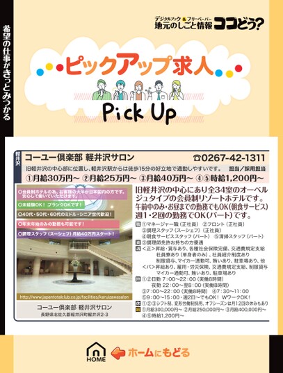 コーユー倶楽部軽井沢サロン☎0267-42-1311担当/採用担当旧軽井沢の中心部に位置し、軽井沢駅からは徒歩15分の好立地で通勤しやすいです。①月給30万円〜②月給25万円〜③月給40万円〜④⑤時給1,200円〜希望の仕事がきっとみつかる軽井沢〇会員制ホテルの為、お客様の大半が日本国内の方です。安心して働いていただけます。〇未経験OK!ブランクOKです!〇40代・50代・60代のミドル・シニア世代歓迎!〇年末年始のみの勤務も可能です!〇調理スタッフ(スーシェフ)月給40万円スタート!http://www.japantotalclub.co.jp/facilities/karuizawasalonコーユー倶楽部軽井沢サロン長野県北佐久郡軽井沢町軽井沢2-3旧軽井沢の中心にあり全34室のオーベルジュタイプの会員制リゾートホテルです。午前中のみ・お昼までの勤務でもOK(朝食サービス)週1・2回の勤務でOK(パート)です。①マネージャー職(正社員)②フロント(正社員)③調理スタッフ(スーシェフ)(正社員)④朝食サービススタッフ(パート)⑤清掃スタッフ(パート)③調理師免許お持ちの方優遇<正>昇給・賞与あり、各種社会保険完備、交通費規定支給社員寮あり(単身者のみ)、社員紹介制度あり制服貸与、マイカー通勤可、賄いあり、駐車場あり、他<パ>昇給あり、雇用・労災保険、交通費規定支給、制服貸与マイカー通勤可、賄いあり、駐車場あり①②日勤7:00〜22:00(実働8時間)夜勤22:00〜翌8:00(実働8時間)③7:00〜22:00(実働8時間)④7:30〜11:00⑤9:00〜15:00・週2日〜でもOK!WワークOK!①②③シフト制、変形労働制採用、オフシーズンは月12回の休みもあり①月給300,000円〜②月給250,000円〜③月給400,000円〜④⑤時給1,200円〜