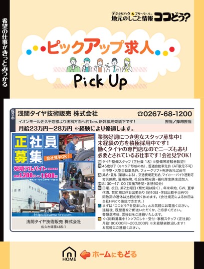 業務好調につき男女スタッフ募集中!未経験の方を積極採用中です!働くタイヤの専門店なのでニーズもあり必要とされているお仕事です!会社見学OK!タイヤ整備スタッフ(正社員1名)※整備等経験者歓迎!45歳以下(キャリア形成の為)、普通自動車免許(AT限定不可)※中型・大型自動車免許、フォークリフト免許あれば尚可昇給・賞与(業績による)、交通費規定支給、マイカー・バイク通勤可労災保険、雇用保険、社会保険完備・福利厚生倶楽部加入8:30〜17:00(実働7時間・休憩90分)日曜、祝日、第2土曜日(繁忙期は除く)、年末年始、GW、夏季休暇、繁忙期は休日出勤あり(約10日・休日出勤手当有り)閑散期の連休は比較的長く休めます。(会社規定による休日は当社HPにて確認できます。)まずは「ココどう?を見ました」とお気軽にお電話ください。連絡後、履歴書をご郵送いただくか、ご持参ください。書類選考後、面接日をご連絡いたします。<<同時募集中!>>フロント・受付・事務スタッフ(正社員)月給180,000円〜200,000円※未経験者歓迎します!お気軽にご連絡ください。https://asama-tire.com浅間タイヤ技術販売株式会社佐久市塚原465-1希望の仕事がきっとみつかる佐久市浅間タイヤ技術販売株式会社イオンモール佐久平店様より浅科方面へ約1km、新幹線高架橋下です!月給23万円〜28万円※経験により優遇します。☎0267-68-1200担当/採用担当員正社募集短期アルバイト時給1,200円〜(経験者優遇)1,600円(随時スタートから12月中旬〜下旬まで)会社見学OK!