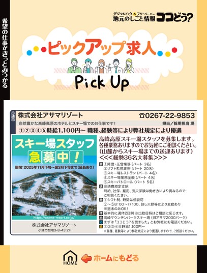 株式会社アサマリゾート☎0267-22-9853自然豊かな高峰高原のホテルとスキー場でのお仕事です!①②③④⑤時給1,100円〜職種、経験等により弊社規定により優遇担当/採用担当堤希望の仕事がきっとみつかる小諸市スキー場スタッフ急募中!期間:2025年11月下旬〜翌3月下旬まで(延長あり)https://asama-resort.co.jp/株式会社アサマリゾート小諸市加増3-8-432F高峰高原スキー場スタッフを募集します。各種業務ありますのでお気軽にご相談ください。(山麓からスキー場までの送迎あります)<<<総勢36名大募集>>>①降雪・圧雪業務(パート3名)②リフト監視業務(パート20名)③スキー場レストラン(パート4名)④スキー場業務全般(パート4名)⑤スキーパトロール(パート5名)交通費規定支給時給、社保、雇用、労災保険は働き方により異なるのでご相談ください。①シフト制、時間は相談可②〜⑤8:00〜17:00、但し天候等により変動あり※週末のみOK!基本的に週休2日制※出勤日時はご相談に応じます。高峰マウンテンパークスキー場(旧アサマ2000パーク)まずは「ココどう?を見ました」とお気軽にお電話ください。①②③④⑤時給1,100円〜※職種、経験等により弊社規定により優遇しますので、ご相談ください。