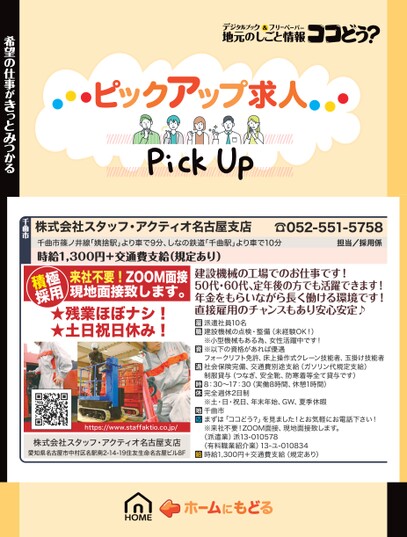 株式会社スタッフ・アクティオ名古屋支店千曲市篠ノ井線「姨捨駅」より車で9分、しなの鉄道「千曲駅」より車で10分時給1,300円+交通費支給(規定あり)☎052-551-5758担当/採用係希望の仕事がきっとみつかる千曲市建設機械の工場でのお仕事です!50代・60代、定年後の方でも活躍できます!年金をもらいながら長く働ける環境です!直接雇用のチャンスもあり安心安定♪派遣社員10名建設機械の点検・整備(未経験OK!)※小型機械もある為、女性活躍中です!※以下の資格があれば優遇フォークリフト免許、床上操作式クレーン技能者、玉掛け技能者社会保険完備、交通費別途支給(ガソリン代規定支給)制服貸与(つなぎ、安全靴、防寒着等全て貸与です)8:30〜17:30(実働8時間、休憩1時間)完全週休2日制※土・日・祝日、年末年始、GW、夏季休暇千曲市まずは「ココどう?」を見ました!とお気軽にお電話下さい!※来社不要!ZOOM面接、現地面接致します。(派遣業)派13-010578(有料職業紹介業)13-ユ-010834時給1,300円+交通費支給(規定あり)来社不要!ZOOM面接現地面接致します。残業ほぼナシ!★土日祝日休み!用★極積採https://www.staffaktio.co.jp/株式会社スタッフ・アクティオ名古屋支店愛知県名古屋市中村区名駅南2-14-19住友生命名古屋ビル8F
