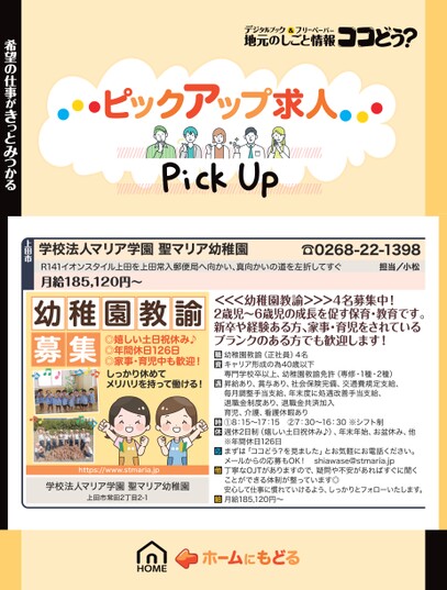 学校法人マリア学園聖マリア幼稚園R141イオンスタイル上田を上田常入郵便局へ向かい、真向かいの道を左折してすぐ月給185,120円〜☎0268-22-1398担当/小松希望の仕事がきっとみつかる上田市幼稚園教諭募集◎嬉しい土日祝休み♪◎年間休日126日◎家事・育児中も歓迎!しっかり休めてメリハリを持って働ける!https://www.stmaria.jp学校法人マリア学園聖マリア幼稚園上田市常田2丁目2-1<<<幼稚園教諭>>>4名募集中!2歳児〜6歳児の成長を促す保育・教育です。新卒や経験ある方、家事・育児をされているブランクのある方でも歓迎します!幼稚園教諭(正社員)4名キャリア形成の為40歳以下専門学校卒以上、幼稚園教諭免許(専修・1種・2種)昇給あり、賞与あり、社会保険完備、交通費規定支給、毎月調整手当支給、年末度に処遇改善手当支給、退職金制度あり、退職金共済加入育児、介護、看護休暇あり①8:15〜17:15②7:30〜16:30※シフト制週休2日制(嬉しい土日祝休み♪)、年末年始、お盆休み、他※年間休日126日まずは「ココどう?を見ました」とお気軽にお電話ください。メールからの応募もOK!shiawase@stmaria.jp丁寧なOJTがありますので、疑問や不安があればすぐに聞くことができる体制が整っています◎安心して仕事に慣れていけるよう、しっかりとフォローいたします。月給185,120円〜