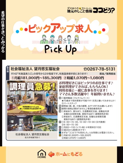 社会福祉法人望月悠玄福祉会☎0267-78-5131R142「布施温泉入口」の信号から2分程度です。布施温泉様手前にあります!①月給181,900円〜185,300円②時給1,070円〜1,080円担当/採用担当希望の仕事がきっとみつかる佐久市調理員急募!お料理好きにはピッタリのお仕事です♪家庭料理ができれば、もちろんOK!利用者様と一緒に食事を作ります!ママさん多数活躍中!年齢問いません♪利用者様といっしょに楽しく料理をするお仕事です。https://www.yuugen-fukushikai.com/fuseya/index.html社会福祉法人望月悠玄福祉会佐久市布施769-1①臨時職員(フルタイムパート)★70歳まで契約更新が可能です!元気に働いてみませんか!②パートスタッフ調理員(朝、昼、夕食の調理、おやつ作りをお願いします)調理の資格必要ありません♪普通自動車免許①昇給あり、賞与あり、交通費規定支給、退職金共済各種社会保険完備、資格手当あり(調理師免許等)②昇給あり、交通費規定支給、各種社会保険完備資格手当あり(調理師免許等)①6:00〜15:00、10:00〜19:00(交代勤務)②6:00〜15:00①月8日〜11日(シフト制)※年間休日110日②週2日から勤務OKです!まずは「ココどう?を見ました」とお気軽にお電話ください。①月給181,900円〜185,300円②時給1,070円〜1,080円