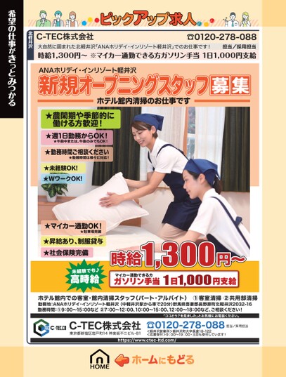 C-TEC株式会社☎0120-278-088担当/採用担当大自然に囲まれた北軽井沢「ANAホリデイ・インリゾート軽井沢」でのお仕事です!時給1,300円〜※マイカー通勤できる方ガソリン手当1日1,000円支給ANAホリデイ・インリゾート軽井沢新規オープニングスタッフホテル館内清掃のお仕事です募集★農閑期や季節的に働ける方歓迎!★週1日勤務からOK!★午前中または、午後のみでもOK!★勤務時間ご相談ください★勤務時間は様々に対応!★未経験OK!★WワークOK!★マイカー通勤OK!★駐車場完備★昇給あり、制服貸与★社会保険完備未経験でも♪高時給時給1,300円〜マイカー通勤できる方ガソリン手当日円支給11,000ホテル館内での客室・館内清掃スタッフ(パート・アルバイト)①客室清掃②共用部清掃勤務地:ANAホリデイ・インリゾート軽井沢(中軽井沢駅から車で20分)群馬県吾妻郡長野原町北軽井沢2032-16勤務時間:①9:00〜15:00など②7:00〜12:00、10:00〜15:00、12:00〜18:00など、ご相談ください!「ココどう?を見ました」とお気軽にお電話ください。C-TEC株式会社東京都新宿区岩戸町14神楽坂不二ビル-B1☎0120-278-088<軽井沢営業所>軽井沢町大字長倉18-122<応募受付>9:00〜19:00・土日も受付しています!担当/採用担当https://www.ctec-ltd.com/北軽井沢希望の仕事がきっとみつかる