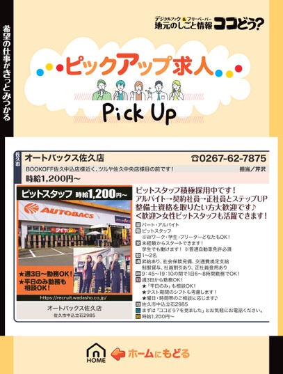 ☎0267-62-7875担当/芹沢オートバックス佐久店BOOKOFF佐久中込店様近く、ツルヤ佐久中央店様目の前です!時給1,200円〜佐久市ピットスタッフ時給1,200円〜★週3日〜勤務OK!★平日のみ勤務も相談OK!https://recruit.wadasho.co.jp/オートバックス佐久店佐久市中込立石2985ピットスタッフ積極採用中です!アルバイト→契約社員→正社員とステップUP整備士資格を取りたい方大歓迎です♪<歓迎>女性ピットスタッフも活躍できます!パート・アルバイトピットスタッフ※Wワーク・学生・フリーターどなたもOK!未経験からスタートできます!学生でも働けます!※普通自動車免許必須1〜2名昇給あり、社会保険完備、交通費規定支給制服貸与、社員割引あり、正社員登用あり9:45〜19:10の間で1日6〜8時間勤務でOK!週3日から勤務OK!★「平日のみ」も相談OK!★テスト期間のシフトも考慮します!★曜日・時間帯のご相談に応じます♪佐久市中込立石2985まずは「ココどう?を見ました」とお気軽にお電話ください。時給1,200円〜希望の仕事がきっとみつかる