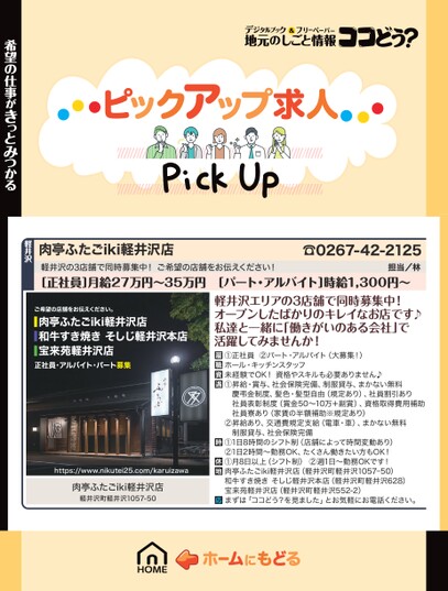 肉亭ふたごiki軽井沢店軽井沢の3店舗で同時募集中!ご希望の店舗をお伝えください!☎0267-42-2125担当/林[正社員]月給27万円〜35万円[パート・アルバイト]時給1,300円〜ご希望の店舗をお伝えください。肉亭ふたごiki軽井沢店和牛すき焼きそしじ軽井沢本店宝来苑軽井沢店正社員・アルバイト・パート募集https://www.nikutei25.com/karuizawa肉亭ふたごiki軽井沢店軽井沢町軽井沢1057-50軽井沢エリアの3店舗で同時募集中!オープンしたばかりのキレイなお店です♪私達と一緒に「働きがいのある会社」で活躍してみませんか!①正社員②パート・アルバイト(大募集!)ホール・キッチンスタッフ未経験でOK!資格やスキルも必要ありません♪①昇給・賞与、社会保険完備、制服貸与、まかない無料慶弔金制度、髪色・髪型自由(規定あり)、社員割引あり社員表彰制度(賞金50〜10万+副賞)、資格取得費用補助社員寮あり(家賃の半額補助※規定あり)②昇給あり、交通費規定支給(電車・車)、まかない無料制服貸与、社会保険完備①1日8時間のシフト制(店舗によって時間変動あり)②1日2時間〜勤務OK、たくさん働きたい方もOK!①月8日以上(シフト制)②週1日〜勤務OKです!肉亭ふたごiki軽井沢店(軽井沢町軽井沢1057ー50)和牛すき焼きそしじ軽井沢本店(軽井沢町軽井沢628)宝来苑軽井沢店(軽井沢町軽井沢552-2)まずは「ココどう?を見ました」とお気軽にお電話ください。希望の仕事がきっとみつかる軽井沢