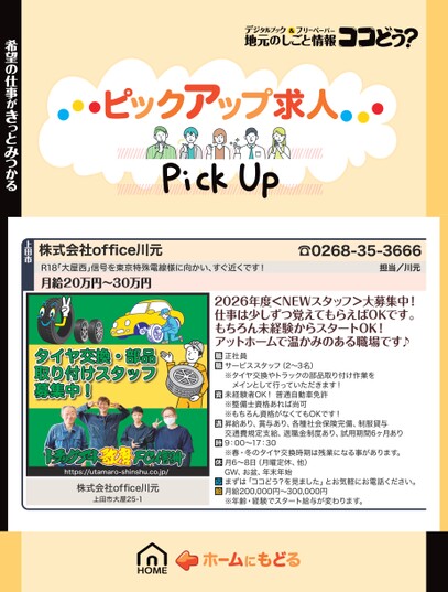 ☎0268-35-3666担当/川元株式会社office川元R18「大屋西」信号を東京特殊電線様に向かい、すぐ近くです!月給20万円〜30万円上田市タイヤ交換・部品取り付けスタッフ募集中!https://utamaro-shinshu.co.jp/株式会社office川元上田市大屋25-12026年度<NEWスタッフ>大募集中!仕事は少しずつ覚えてもらえばOKです。もちろん未経験からスタートOK!アットホームで温かみのある職場です♪正社員サービススタッフ(2〜3名)※タイヤ交換やトラックの部品取り付け作業をメインとして行っていただきます!未経験者OK!普通自動車免許※整備士資格あれば尚可※もちろん資格がなくてもOKです!昇給あり、賞与あり、各種社会保険完備、制服貸与交通費規定支給、退職金制度あり、試用期間6ヶ月あり9:00〜17:30※春・冬のタイヤ交換時期は残業になる事があります。月6〜8日(月曜定休、他)GW、お盆、年末年始まずは「ココどう?を見ました」とお気軽にお電話ください。月給200,000円〜300,000円※年齢・経験でスタート給与が変わります。希望の仕事がきっとみつかる