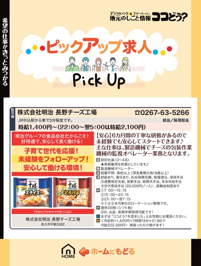 株式会社明治長野チーズ工場JR中込駅から車で3分程度です。時給1,400円〜(22:00〜翌5:00は時給2,100円)☎0267-63-5266担当/採用担当希望の仕事がきっとみつかる佐久市明治グループの食品会社だからこそ!好待遇で、安心して長く働ける!子育て世代を応援!未経験をフォローアップ!安心して働ける環境!https://www.meiji.co.jp/株式会社明治長野チーズ工場佐久市平賀2082【安心】6カ月間の丁寧な研修があるので未経験でも安心してスタートできます♪主な仕事は、製造機械でチーズの包装作業機械の監視オペレーター業務となります。契約社員(3〜4名)★長期雇用を前提としています♪製造機械オペレーター経験不問、高校以上(深夜業務の為18歳以上)昇給あり、賞与あり、社会保険完備、制服貸与、深夜手当交通費規定支給、皆勤手当、時間外手当、年末年始手当次世代育成手当(20,000円/一人)、退職金制度あり①7:00〜15:15②15:00〜23:15③23:00〜翌7:15※①②③を月単位のローテーション勤務です。週休2日制(シフト制)GW、お盆、長期休暇取得可能です!まずは「ココどう?を見ました」とお気軽にお電話ください。<月収例>1,400円×7時間15分×21.9日で月給222,285円!頑張っただけ稼げます!