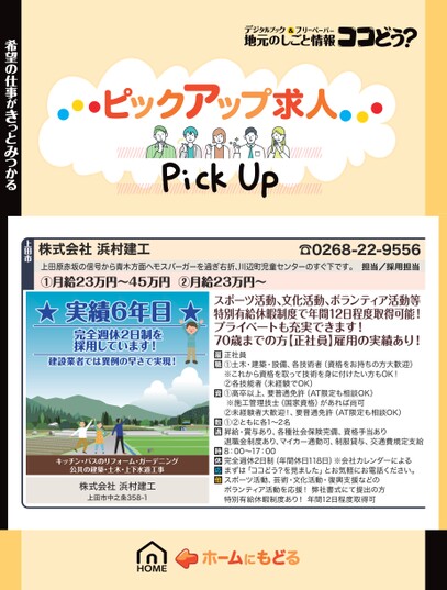 株式会社浜村建工☎0268-22-9556担当/採用担当上田原赤坂の信号から青木方面へモスバーガーを過ぎ右折、川辺町児童センターのすぐ下です。①月給23万円〜45万円②月給23万円〜★実績6年目★完全週休2日制を採用しています!建設業者では異例の早さで実現!キッチン・バスのリフォーム・ガーデニング公共の建築・土木・上下水道工事株式会社浜村建工上田市中之条358-1スポーツ活動、文化活動、ボランティア活動等特別有給休暇制度で年間12日程度取得可能!プライベートも充実できます!70歳までの方【正社員】雇用の実績あり!正社員①土木・建築・設備、各技術者(資格をお持ちの方大歓迎)※これから資格を取って技術を身に付けたい方もOK!②各技能者(未経験でOK)①高卒以上、要普通免許(AT限定も相談OK)※施工管理技士(国家資格)があれば尚可②未経験者大歓迎!、要普通免許(AT限定も相談OK)①②ともに各1〜2名昇給・賞与あり、各種社会保険完備、資格手当あり退職金制度あり、マイカー通勤可、制服貸与、交通費規定支給8:00〜17:00完全週休2日制(年間休日118日)※会社カレンダーによるまずは「ココどう?を見ました」とお気軽にお電話ください。スポーツ活動、芸術・文化活動・復興支援などのボランティア活動を応援!弊社書式にて提出の方特別有給休暇制度あり!年間12日程度取得可希望の仕事がきっとみつかる上田市