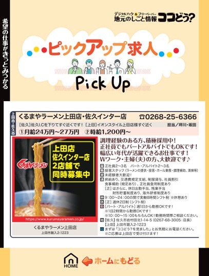 くるまやラーメン上田店・佐久インター店[佐久]佐久I.Cを下りてすぐ近くです![上田]イオンスタイル上田店様すぐ近く①月給24万円〜27万円②時給1,200円〜☎0268-25-6366担当/坪川・坂田上田店佐久インター店2店舗で同時募集中https://www.kurumayaramen.co.jp/くるまやラーメン上田店上田市踏入2-1223調理経験のある方、積極採用中!正社員でもパートアルバイトでもOKです!幅広い年代が活躍できるお仕事です!Wワーク・主婦(夫)の方、大歓迎です♪正社員2〜3名パート・アルバイト2〜3名接客スタッフ(ラーメンの提供・接客・ホール業務・調理補助、清掃等)未経験者大歓迎!昇給あり、交通費規定支給、制服貸与、社員割引食事補助(規定あり)、正社員登用制度あり[正]はさらに、休日出勤手当、残業手当財形貯蓄制度あり、海外研修制度あり9:00〜24:00の間で実働8時間シフト制※休憩あり[正]週休2日制(シフト制)[パート・アルバイト]週1日から勤務OKです!※1日2時間から勤務OKです!※10:00〜15:00もちろんOK!勤務時間帯ご相談ください。【佐久】佐久市岩村田北1-14-5(0267-68-3005:店長)【上田】上田市踏入2-1223まずは「ココどう?を見ました」とお気軽にお電話ください。※ご応募は上田店で受け付けます!希望の仕事がきっとみつかる上田市・佐久市