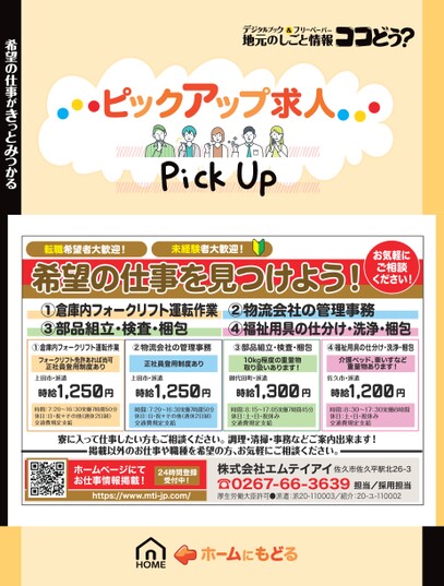 転職希望者大歓迎!未経験者大歓迎!お気軽にご相談ください!希望の仕事を見つけよう!①倉庫内フォークリフト運転作業③部品組立・検査・梱包②物流会社の管理事務④福祉用具の仕分け・洗浄・梱包①倉庫内フォークリフト運転作業②物流会社の管理事務③部品組立・検査・梱包④福祉用具の仕分け・洗浄・梱包フォークリフト免許あれば尚可正社員登用制度あり正社員登用制度あり上田市・派遣時給1,250円上田市・派遣時給1,250円10kg程度の重量物取り扱いあります!御代田町・派遣時給1,300円介護ベッド、車いすなど重量物あります!佐久市・派遣時給1,200円時間:7:20〜16:30実働7時間50分休日:日・祝+その他(週休2日制)交通費規定支給時間:7:20〜16:30実働7時間50分休日:日・祝+その他(週休2日制)交通費規定支給時間:8:15〜17:05実働7時間45分休日:土・日・祝休み交通費規定支給時間:8:30〜17:30実働8時間休日:土・日・祝休み交通費規定支給寮に入って仕事したい方もご相談ください。調理・清掃・事務などご案内出来ます!掲載以外のお仕事や職種を希望の方、お気軽にご相談ください。ホームページにてお仕事情報掲載!受付中!https://www.mti-jp.com/24時間登録株式会社エムテイアイ佐久市佐久平駅北26-3☎0267-66-3639厚生労働大臣許可●派遣:派20-110003/紹介:20-ユ-110002担当/採用担当希望の仕事がきっとみつかる