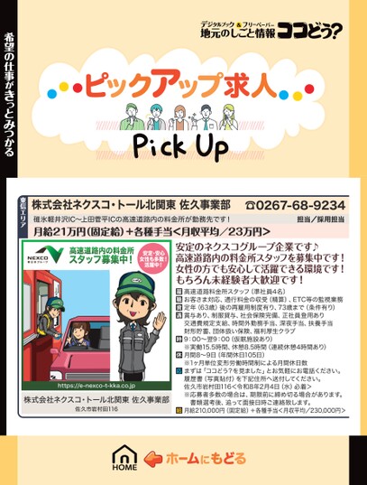 株式会社ネクスコ・トール北関東佐久事業部☎0267-68-9234碓氷軽井沢IC〜上田菅平ICの高速道路内の料金所が勤務先です!月給21万円(固定給)+各種手当<月収平均/23万円>担当/採用担当希望の仕事がきっとみつかる東信エリア安定・安心女性も多数!活躍中!https://e-nexco-t-kka.co.jp株式会社ネクスコ・トール北関東佐久事業部佐久市岩村田116安定のネクスコグループ企業です♪高速道路内の料金所スタッフを募集中です!女性の方でも安心して活躍できる環境です!もちろん未経験者大歓迎です!高速道路料金所スタッフ(準社員4名)お客さま対応、通行料金の収受(精算)、ETC等の監視業務定年(63歳)後の再雇用制度有り、73歳まで(条件有り)賞与あり、制服貸与、社会保険完備、正社員登用あり交通費規定支給、時間外勤務手当、深夜手当、扶養手当財形貯蓄、団体扱い保険、福利厚生クラブ9:00〜翌9:00(仮眠施設あり)※実働15.5時間、休憩8.5時間(連続休憩4時間あり)月間8〜9日(年間休日105日)※1ヶ月単位変形労働時間制による月間休日数まずは「ココどう?を見ました」とお気軽にお電話ください。履歴書(写真貼付)を下記住所へ送付してください。佐久市岩村田116<令和8年2月4日(水)必着>※応募者多数の場合は、期限前に締め切る場合があります。書類選考後、追って面接日時ご連絡致します。月給210,000円(固定給)+各種手当<月収平均/230,000円>