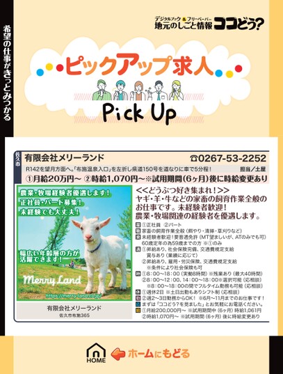 有限会社メリーランド☎0267-53-2252担当/土屋R142を望月方面へ。布施温泉入口」を左折し県道150号を道なりに車で5分程!①月給20万円〜②時給1,070円〜※試用期間(6ヶ月)後に時給変更あり希望の仕事がきっとみつかる佐久市農業・牧場経験者優遇します!正社員・パート募集!未経験でも大丈夫!幅広い年齢層の方が活躍できます!https://merry-land.co.jp/有限会社メリーランド佐久市布施365<<どうぶつ好き集まれ!>>ヤギ・羊・牛などの家畜の飼育作業全般のお仕事です。未経験者歓迎!農業・牧場関連の経験者を優遇します。①正社員②パート家畜の飼育作業全般(やり・清掃・草刈りなど)未経験者歓迎!要普通免許(MT望ましいが、ATのみでも可)60歳定年の為59歳までの方※①のみ①昇給あり、社会保険完備、交通費規定支給賞与あり(業績に応じて)②昇給あり、雇用・労災保険、交通費規定支給※条件により社会保険も可①8:00〜18:00(実働8時間)※残業あり(最大40時間)②8:00〜12:00、14:00〜18:00※選択可能(応相談)※8:00〜18:00の間でフルタイム勤務も可能(応相談)①週休2日※土日出勤もありシフト制(応相談)②週2〜3日勤務からOK!※6月〜11月までのお仕事です!まずは「ココどう?を見ました」とお気軽にお電話ください。①月給200,000円〜※試用期間中(6ヶ月)時給1,061円②時給1,070円〜※試用期間(6ヶ月)後に時給変更あり
