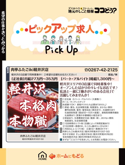 軽井沢の3店舗で同時募集中!ご希望の店舗をお伝えください![正社員]月給27万円〜35万円[パート・アルバイト]時給1,300円〜☎0267-42-2125担当/林軽井沢エリアの3店舗で同時募集中!オープンしたばかりのキレイなお店です♪私達と一緒に「働きがいのある会社」で活躍してみませんか!①正社員②パート・アルバイト(大募集!)ホール・キッチンスタッフ未経験でOK!資格やスキルも必要ありません♪①昇給・賞与、社会保険完備、制服貸与、まかない無料慶弔金制度、髪色・髪型自由(規定あり)、社員割引あり社員表彰制度(賞金50〜10万+副賞)、資格取得費用補助社員寮あり(家賃の半額補助※規定あり)②昇給あり、交通費規定支給(電車・車)、まかない無料制服貸与、社会保険完備①1日8時間のシフト制(店舗によって時間変動あり)②1日2時間〜勤務OK、たくさん働きたい方もOK!①月8日以上(シフト制)②週1日〜勤務OKです!肉亭ふたごiki軽井沢店(軽井沢町軽井沢1057ー50)和牛すき焼きそしじ軽井沢本店(軽井沢町軽井沢628)宝来苑軽井沢店(軽井沢町軽井沢552-2)まずは「ココどう?を見ました」とお気軽にお電話ください。肉亭ふたごiki軽井沢店軽井沢本格肉本物職https://www.nikutei25.com/karuizawa肉亭ふたごiki軽井沢店軽井沢町軽井沢1057-50希望の仕事がきっとみつかる軽井沢