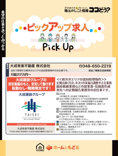 ☎048-650-2219担当/関東支店採用係大成有楽不動産株式会社当社で管理する軽井沢エリアの巡回管理物件のお仕事です。月給22万円〜軽井沢希望の仕事がきっとみつかる大成建設グループの安定基盤のもと、安定して働けます転勤なし・職務限定です!大成建設グループhttps://www.taisei-yuraku.co.jp/大成有楽不動産株式会社〒330-0843埼玉県さいたま市大宮区吉敷町4-262-14<<軽井沢エリアの巡回管理物件>>定期点検(月次、年次)の実施日調整や立会業務臨時修繕業務などの提案書・見積書作成客先への定期報告業務等のお仕事です。正社員※60歳定年(65歳まで再雇用あり)当社で管理する軽井沢エリアの巡回管理物件の設備管理※定期点検(月次、年次)の実施日調整や立会業務、臨時修繕業務などの提案書・見積書作成、客先への定期報告業務等のお仕事です。ビル設備管理経験がある方歓迎!社会保険完備、交通費全額支給、制服貸与、車通勤OK、有給休暇あり、他8:30〜17:30(休憩1時間)※ご不明な点などご相談ください。まずは「ココどう?を見ました」とお気軽にお電話ください。大成建設グループの安定基盤のもと、安定して働けます。転勤なし・職務限定です!月額220,000円〜(賞与年2回+時間外手当+深夜割増手当別途支給)