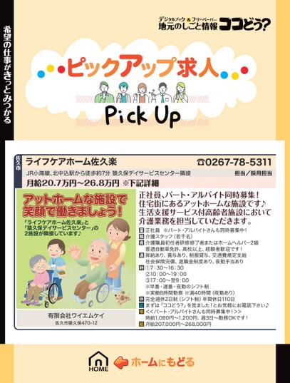 ☎0267-78-5311担当/採用担当ライフケアホーム佐久楽JR小海線、北中込駅から徒歩約7分猿久保デイサービスセンター隣接月給20.7万円〜26.8万円※下記詳細佐久市希望の仕事がきっとみつかるアットホームな施設で笑顔で働きましょう!「ライフケアホーム佐久楽」と「猿久保デイサービスセンター」の2施設が隣接しています♪有限会社ワイエムケイ佐久市猿久保470-12正社員、パート・アルバイト同時募集!住宅街にあるアットホームな施設です♪生活支援サービス付高齢者施設において介護業務を担当していただきます。正社員※パート・アルバイトさんも同時募集中!介護スタッフ(若干名)介護職員初任者研修修了者またはホームヘルパー2級普通自動車免許、高校以上、経験者歓迎です!昇給あり、賞与あり、制服貸与、交通費規定支給社会保険完備、退職金制度あり、夜勤手当あり①7:30〜16:30②10:00〜19:00③17:00〜翌9:00※早番・遅番・夜勤のシフト制※実働8時間勤務※週40時間(夜勤あり)完全週休2日制(シフト制)年間休日110日まずは「ココどう?」を見ました!とお気軽にお電話下さい♪<<パート・アルバイトさんも同時募集中!>>時給1,080円〜1,200円、週3日〜勤務OKです!月給207,000円〜268,000円