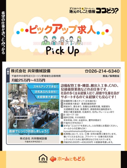 スキルアップできる!活気あふれる会社!未経験者大歓迎!設備配管工事・機器、搬出入工事、CAD、見積積算業務などのお仕事です。社員の多くは未経験入社で、研修や先輩社員がサポートするので未経験でも安心です!☎026-214-6340担当/採用担当株式会社共栄機械設備千曲市中の信号近くローソン更埴埴生店様南側月給25万円〜43万円千曲市設備配管工事スタッフ(正社員2名)未経験者大歓迎!普通自動車免許昇給あり、賞与あり、各種社会保険完備、制服貸与交通費規定支給、車通勤可、資格取得支援制度あり、家族介護支援制度、社員旅行、社内レクレーションあり8:00〜17:00週休2日制、その他祝日年末年始、GW、お盆休み、慶弔休暇あり千曲市大字中250-1まずは「ココどう?を見ました」とお気軽にお電話ください。メールからの応募もOK!kyoueikikaisetsubi@jewel.ocn.ne.jp各現場において、ビル・工場・住宅の配管工事を行います。働いてくださる方には、プライベート・仕事の両方充実していただくために福利厚生など力を入れています。月給250,000円〜430,000円※経験者考慮します。面接でじっくりお話しましょう!株式会社共栄機械設備千曲市大字中250-1希望の仕事がきっとみつかる