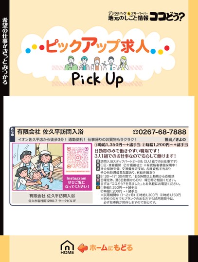 有限会社佐久平訪問入浴イオン佐久平店から徒歩3分!通勤便利!仕事帰りのお買物もラクラク!☎0267-68-7888担当/きよの①時給1,350円〜+諸手当②時給1,200円〜+諸手当日勤帯のみで働きやすい職場です!3人1組でのお仕事なので安心して働けます!Instagramぜひご覧になってください!有限会社佐久平訪問入浴佐久市岩村田1290-7ラークビル1F訪問入浴スタッフパート2〜3名(3人1組でのお仕事です)①正・准看護師②介護福祉士※有資格者積極採用中!社会保険完備、交通費規定支給、各種資格手当ありその他処遇改善加算あり、有給休暇あり8:30〜17:30の間で、1日5時間以上勤務から応相談日曜定休、週3日勤務からOK!曜日等ご相談ください。まずは「ココどう?を見ました」とお気軽にお電話ください。①時給1,350円〜+諸手当②時給1,200円〜+諸手当※試用期間中(1〜2ヶ月)①時給1,300円②時給1,150円※初めての方でもブランクのある方でも試用期間中は、必ず指導員が同伴しますので安心です。希望の仕事がきっとみつかる佐久市