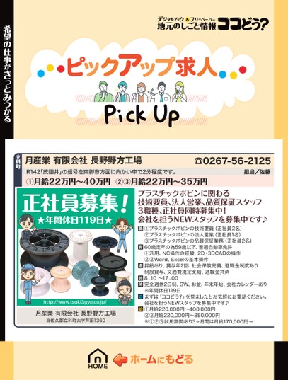 月産業有限会社長野野方工場R142「茂田井」の信号を東御市方面に向かい車で2分程度です。①月給22万円〜40万円②③月給22万円〜35万円☎0267-56-2125担当/佐藤正社員募集!★年間休日119日★プラスチックボビンに関わる技術要員、法人営業、品質保証スタッフ3職種、正社員同時募集中!会社を担うNEWスタッフを募集中です♪①プラスチックボビンの技術要員(正社員2名)②プラスチックボビンの法人営業(正社員1名)③プラスチックボビンの品質保証業務(正社員2名)60歳定年の為59歳以下、普通自動車免許①汎用、NC操作の経験、2D・3DCADの操作②③Word、Excelの基本操作昇給あり、賞与年2回、社会保険完備、退職金制度あり制服貸与、交通費規定支給、退職金共済8:10〜17:00完全週休2日制、GW、お盆、年末年始、会社カレンダーあり※年間休日119日まずは「ココどう?」を見ましたとお気軽にお電話ください。会社を担うNEWスタッフを募集中です♪①月給220,000円〜400,000円②③月給220,000円〜350,000円※①②③試用期間あり3ヶ月間は月給170,000円〜http://www.tsuki3gyo.co.jp/月産業有限会社長野野方工場北佐久郡立科町大字田1360希望の仕事がきっとみつかる立科町