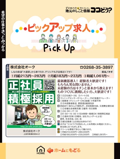 株式会社オーク☎0268-35-3897しなの鉄道「大屋駅」から車で5分、デリシア丸子店様近くです!①月給21万円〜28万円②月給18万円〜23万円③時給1,061円〜担当/オギ希望の仕事がきっとみつかる上田市正社員積極採用新しい環境で働きませんか!ートさんも同時集中!最新機器導入しました!IターンUターン大歓迎!http://e-ohk.smafo.biz/株式会社オーク上田市長瀬2894-2最新機器導入!経験者大歓迎です!もちろん男女問いません♪未経験の方はキチンと基本から教えます!ものづくりに挑戦したい方、大歓迎です!①②正社員2〜3名③パート2名マシニングセンターオペレーター、CNC旋盤オペレーター①経験者(マシニング・CNC旋盤)※年齢不問②③未経験者歓迎、要普通自動車免許昇給あり(能力により随時UP)、初回制服支給、交通費全額支給①②各種社会保険完備③雇用・労災保険①②8:00〜17:10③9:00〜15:00※1日4時間〜勤務OK!時間帯応相談①②週休2日制(日曜他、当社カレンダーによる)夏季、年末年始、GW、他③週5日勤務(土日祝はお休みです)まずは「ココどう?を見ました」とお気軽にお電話ください。担当者におつなぎします。クリーンな環境で安心して働けます。①月給210,000円〜280,000円②月給180,000円〜230,000円③時給1,061円〜