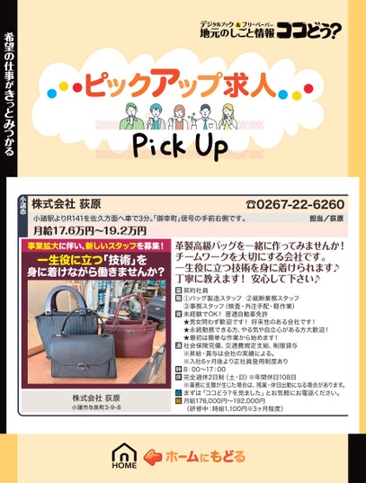 株式会社荻原小諸駅よりR141を佐久方面へ車で3分。御幸町」信号の手前右側です。月給17.6万円〜19.2万円☎0267-22-6260担当/荻原希望の仕事がきっとみつかる小諸市事業拡大に伴い、新しいスタッフを募集!一生役に立つ「技術」を身に着けながら働きませんか?株式会社荻原小諸市与良町3-9-8革製高級バッグを一緒に作ってみませんか!チームワークを大切にする会社です。一生役に立つ技術を身に着けられます♪丁寧に教えます!安心して下さい♪契約社員①バッグ製造スタッフ②裁断業務スタッフ③事務スタッフ(検査・外注手配・軽作業)未経験でOK!普通自動車免許★男女問わず歓迎です!将来性のある会社です!★永続勤務できる方、やる気や自立心がある方大歓迎!★最初は簡単な作業から始めます!社会保険完備、交通費規定支給、制服貸与※昇給・賞与は会社の実績による。※入社6ヶ月後より正社員登用制度あり8:00〜17:00完全週休2日制(土・日)※年間休日108日※業務に支障が生じた場合は、残業・休日出勤になる場合があります。まずは「ココどう?を見ました」とお気軽にお電話ください。月給176,000円〜192,000円(研修中:時給1,100円※3ヶ月程度)