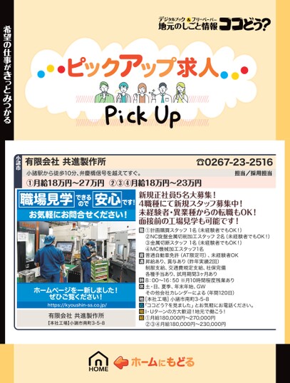 有限会社共進製作所小諸駅から徒歩10分、弁慶橋信号を越えてすぐ。①月給18万円〜27万円②③④月給18万円〜23万円☎0267-23-2516担当/採用担当希望の仕事がきっとみつかる小諸市職場見学安心できるのでお気軽にお問合せください!です!新規正社員5名大募集!4職種にて新規スタッフ募集中!未経験者・異業種からの転職もOK!面接前の工場見学も可能です!①計画購買スタッフ1名(未経験者でもOK!)②NC旋盤金属切削加工スタッフ2名(未経験者でもOK!)③金属切断スタッフ1名(未経験者でもOK!)④MC機械加工スタッフ1名普通自動車免許(AT限定可)、未経験者OK昇給あり、賞与あり(昨年実績2回)制服支給、交通費規定支給、社保完備各種手当あり、試用期間3ヶ月あり8:00〜16:50※月10時間程度残業あり土・日、夏季、年末年始、GWその他会社カレンダーによる(年間120日)[本社工場]小諸市南町3-5-8「ココどう?を見ました」とお気軽にお電話ください。I・Uターンの方大歓迎!地元で働こう!①月給180,000円〜270,000円②③④月給180,000円〜230,000円ホームページを一新しました!ぜひご覧ください!https://kyoushin-ss.co.jp/有限会社共進製作所【本社工場】小諸市南町3-5-8