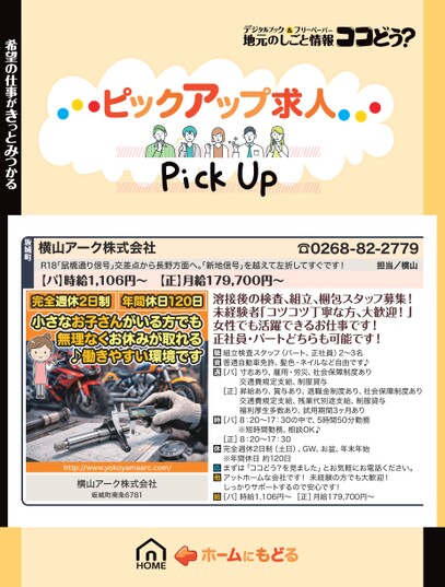 [正]昇給あり、賞与あり、退職金制度あり、社会保障制度あり交通費規定支給、残業代別途支給、制服貸与福利厚生多数あり、試用期間3ヶ月あり[パ]8:20〜17:30の中で、5時間50分勤務※短時間勤務、相談OK♪[正]8:20〜17:30完全週休2日制(土日)、GW、お盆、年末年始※年間休日約120日まずは「ココどう?を見ました」とお気軽にお電話ください。アットホームな会社です!未経験の方でも大歓迎!しっかりサポートするので安心です![パ]時給1,106円〜[正]月給179,700円〜http://www.yokoyamaarc.com/横山アーク株式会社坂城町南条6781希望の仕事がきっとみつかる坂城町横山アーク株式会社☎0268-82-2779R18「鼠橋通り信号」交差点から長野方面へ。新地信号」を越えて左折してすぐです!担当/横山【パ】時給1,106円〜【正】月給179,700円〜完全週休2日制年間休日120日小さなお子さんがいる方でも無理なくお休みが取れる♪働きやすい環境です溶接後の検査、組立、梱包スタッフ募集!未経験者「コツコツ丁寧な方、大歓迎!」女性でも活躍できるお仕事です!正社員・パートどちらも可能です!組立検査スタッフ(パート、正社員)2〜3名普通自動車免許、髪色・ネイルなど自由です♪[パ]寸志あり、雇用・労災、社会保障制度あり交通費規定支給、制服貸与