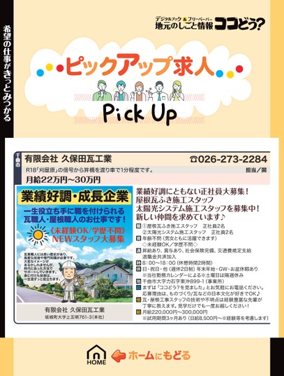 ☎026-273-2284担当/関有限会社久保田瓦工業R18「刈屋原」の信号から笄橋を渡り車で1分程度です。月給22万円〜30万円千曲市希望の仕事がきっとみつかる業績好調・成長企業一生役立ち手に職を付けられる瓦職人・屋根職人のお仕事です!《未経験OK/学歴不問》NEWスタッフ大募集瓦葺職人には長い歴史があり、高度な技術や専門知識が必要です。大変なイメージがあるかしれませんが、時代にあった方法でサポートしていきます。身に付けた技術は、一生涯ずっと役立ちます。有限会社久保田瓦工業坂城町大字上五明761-3(本社)業績好調にともない正社員大募集!屋根瓦ふき施工スタッフ太陽光システム施工スタッフを募集中!新しい仲間を求めています♪①屋根瓦ふき施工スタッフ正社員2名②太陽光システム施工スタッフ正社員2名年齢不問(男女ともに活躍できます)◇未経験OK/学歴不問◇昇給あり、賞与あり、社会保険完備、交通費規定支給退職金共済加入8:00〜18:00(休憩時間2時間)日・祝日・他(週休2日制)年末年始・GW・お盆休暇あり※当社勤務カレンダーによる※土曜日は隔週休み千曲市大字力石字東沖899-1(事業所)まずは「ココどう?を見ました」とお気軽にお電話ください。応募理由は、ものづくり/瓦などの日本文化が好きでOK♪瓦・屋根工事スタッフの技術や不明点は経験豊富な先輩が丁寧に教えます。見学だけでも一度お越しください!月給220,000円〜300,000円※試用期間3ヶ月あり(日給8,500円〜※経験等を考慮します)