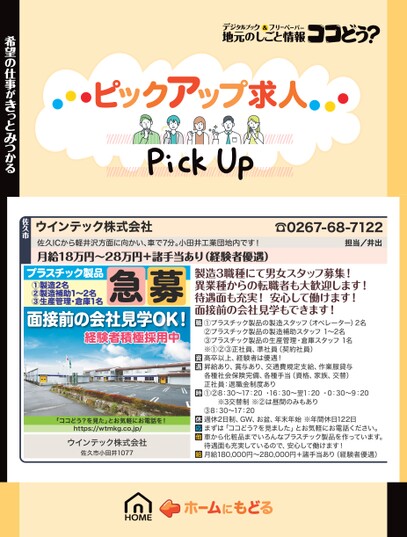 ウインテック株式会社佐久ICから軽井沢方面に向かい、車で7分。小田井工業団地内です!月給18万円〜28万円+諸手当あり(経験者優遇)☎0267-68-7122担当/井出製造3職種にて男女スタッフ募集!異業種からの転職者も大歓迎します!待遇面も充実!安心して働けます!面接前の会社見学もできます!①プラスチック製品の製造スタッフ(オペレーター)2名②プラスチック製品の製造補助スタッフ1〜2名③プラスチック製品の生産管理・倉庫スタッフ1名※①②③正社員、準社員(契約社員)高卒以上、経験者は優遇!昇給あり、賞与あり、交通費規定支給、作業服貸与各種社会保険完備、各種手当(資格、家族、交替)正社員:退職金制度あり①②8:30〜17:20・16:30〜翌1:20・0:30〜9:20※3交替制※②は昼間のみもあり③8:30〜17:20週休2日制、GW、お盆、年末年始※年間休日122日まずは「ココどう?を見ました」とお気軽にお電話ください。車から化粧品までいろんなプラスチック製品を作っています。待遇面も充実しているので、安心して働けます!月給180,000円〜280,000円+諸手当あり(経験者優遇)プラスチック製品①製造2名②製造補助1〜2名③生産管理・倉庫1名急募面接前の会社見学OK!経験者積極採用中「ココどう?を見た」とお気軽にお電話を!https://wtmkg.co.jp/ウインテック株式会社佐久市小田井1077希望の仕事がきっとみつかる佐久市