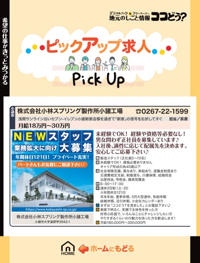 株式会社小林スプリング製作所小諸工場浅間サンライン沿いセブン-イレブン小諸新家店様を過ぎて「新家」の信号を右折してすぐ月給18万円〜30万円☎0267-22-1599担当/荻原希望の仕事がきっとみつかる小諸市NEWスタッフ業務拡大に向け大募集年間休日121日!プライベート充実!パートさんもお気軽にご相談下さい♪https://www.kobayashi-sp.co.jp/株式会社小林スプリング製作所小諸工場小諸市大字滋野甲3942-1未経験でOK!経験や資格等必要なし!男女問わず正社員を募集しています♪入社後、適性に応じて配属先を決めます。安心してご応募下さい♪製造スタッフ(正社員5〜10名)未経験でOK!資格必要ありませんキャリア形成の為40歳以下社会保険完備、賞与あり、昇給あり、退職金制度あり交通費規定支給、制服貸与、介護保険、結婚祝金出産祝金、弔慰金、傷病見舞金8:00〜17:00週休2日制(土・日)※年間休日121日年末年始、夏季休暇、5月大型連休、有給休暇結婚休暇、忌引休暇、※会社カレンダーありまずは「ココどう?を見ました」とお電話下さい♪素直で明るく、笑顔で主体性を持った方好奇心旺盛で、いろんなことにチャレンジしたい方やりすぎるくらいの行動力を持った方を歓迎します!月給180,000円〜300,000円